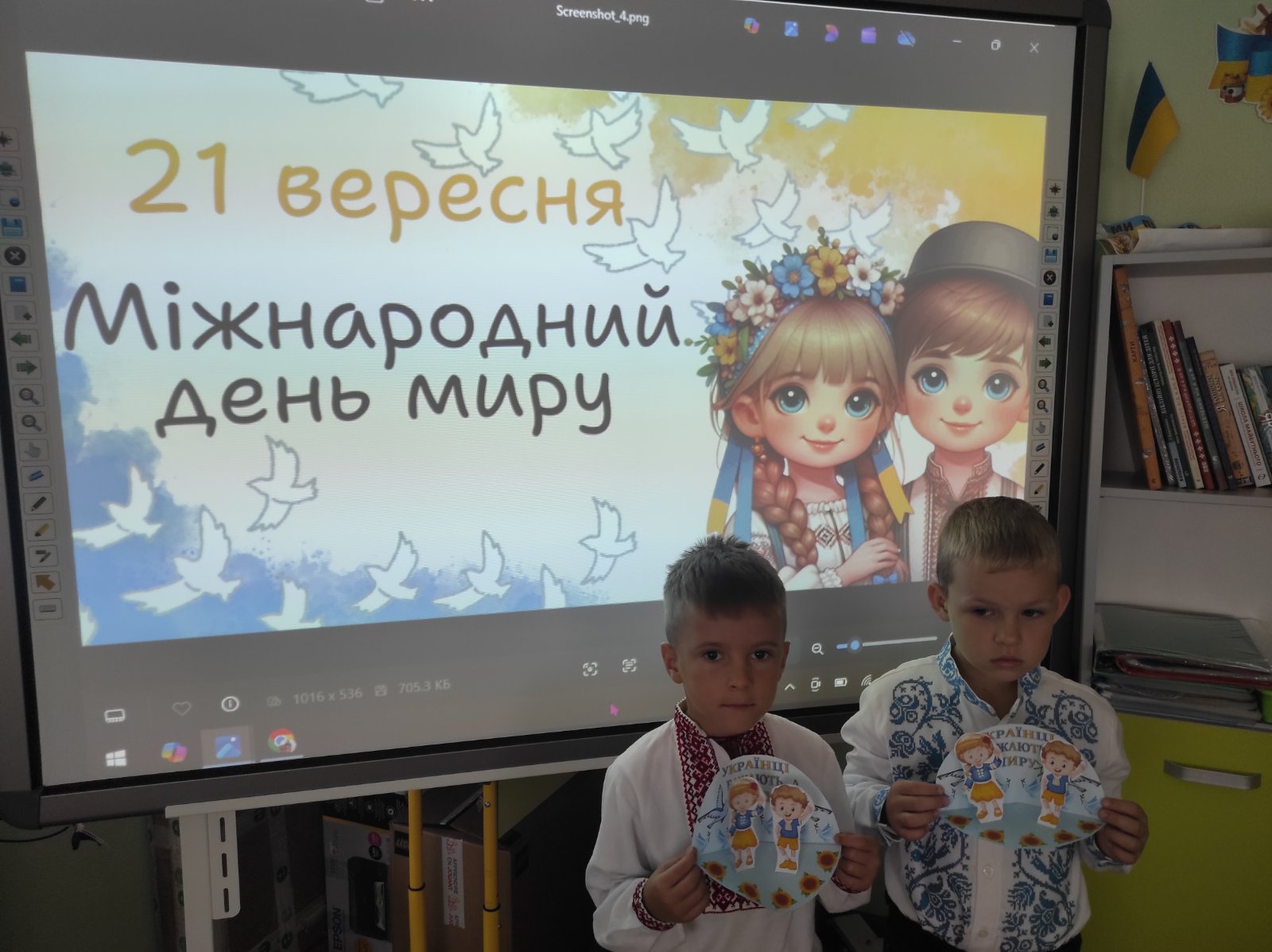 - першокласники ознайомились з історією виникнення свята та зробили об’ємну аплікацію “Українці бажають миру!”;