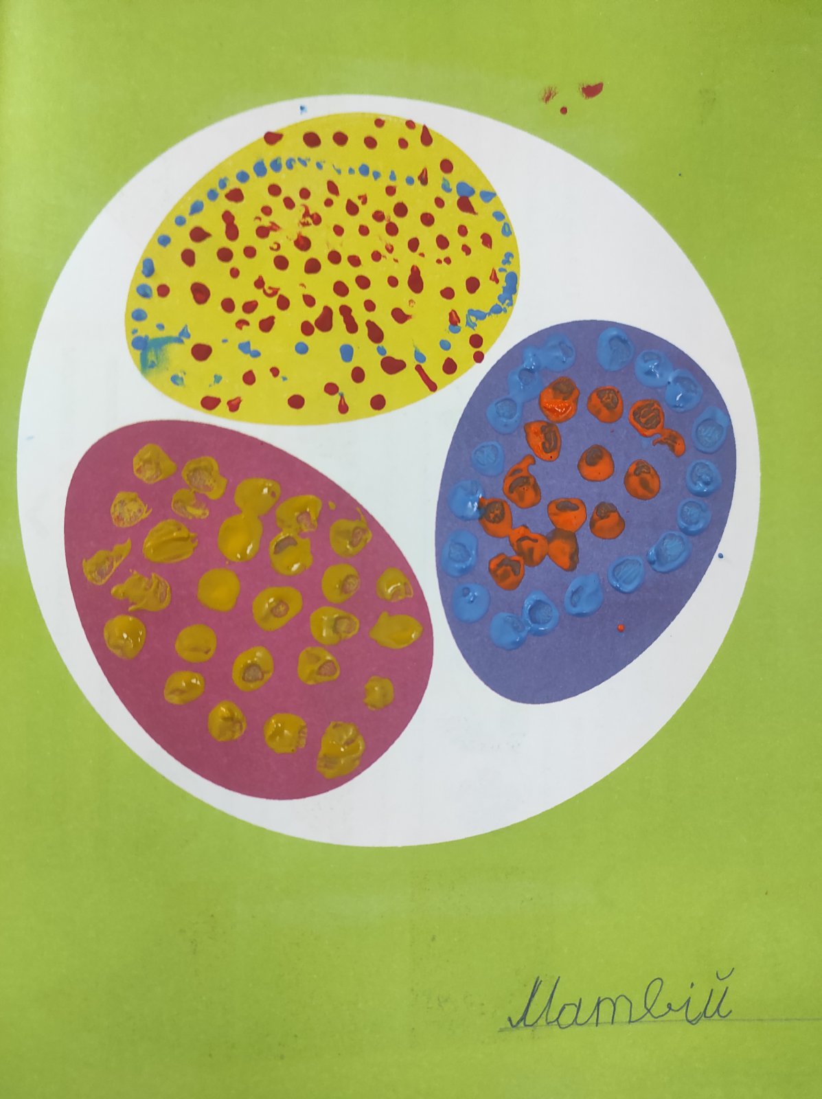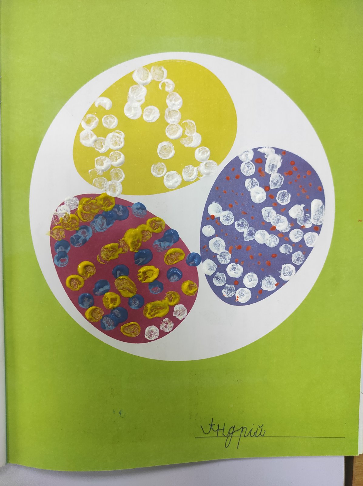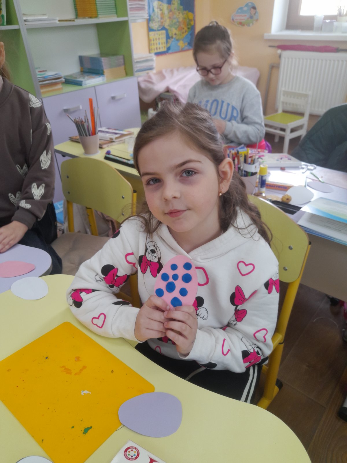 - учні 1 класу малювали пальчиками яйця – крапанки, ліпили об’ємну аплікацію “Гарна писанка у мене”, переглянули відео про “Музей Писанки”, робили перші спроби у розписі писанок воском; досліджували писанки різних регіонів України: аналізували орнаменти, створювали інтерактивну карту “Україна писанкова”, відповідали на питання вікторини (Довгополюк Н. С.);