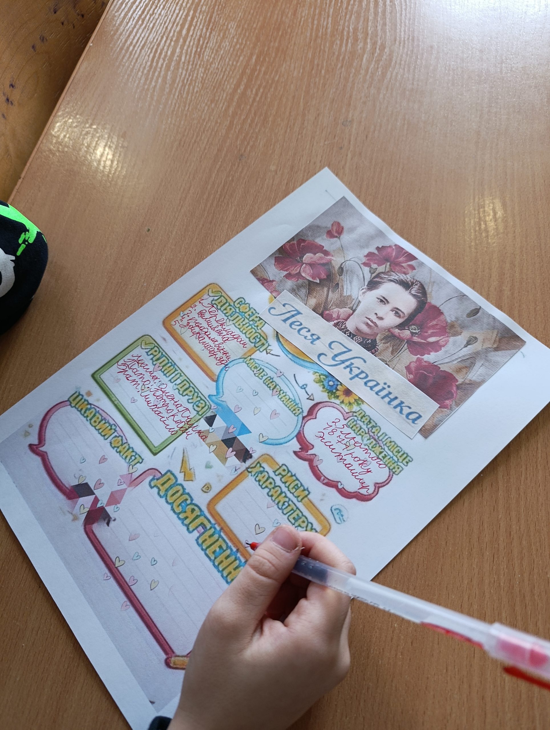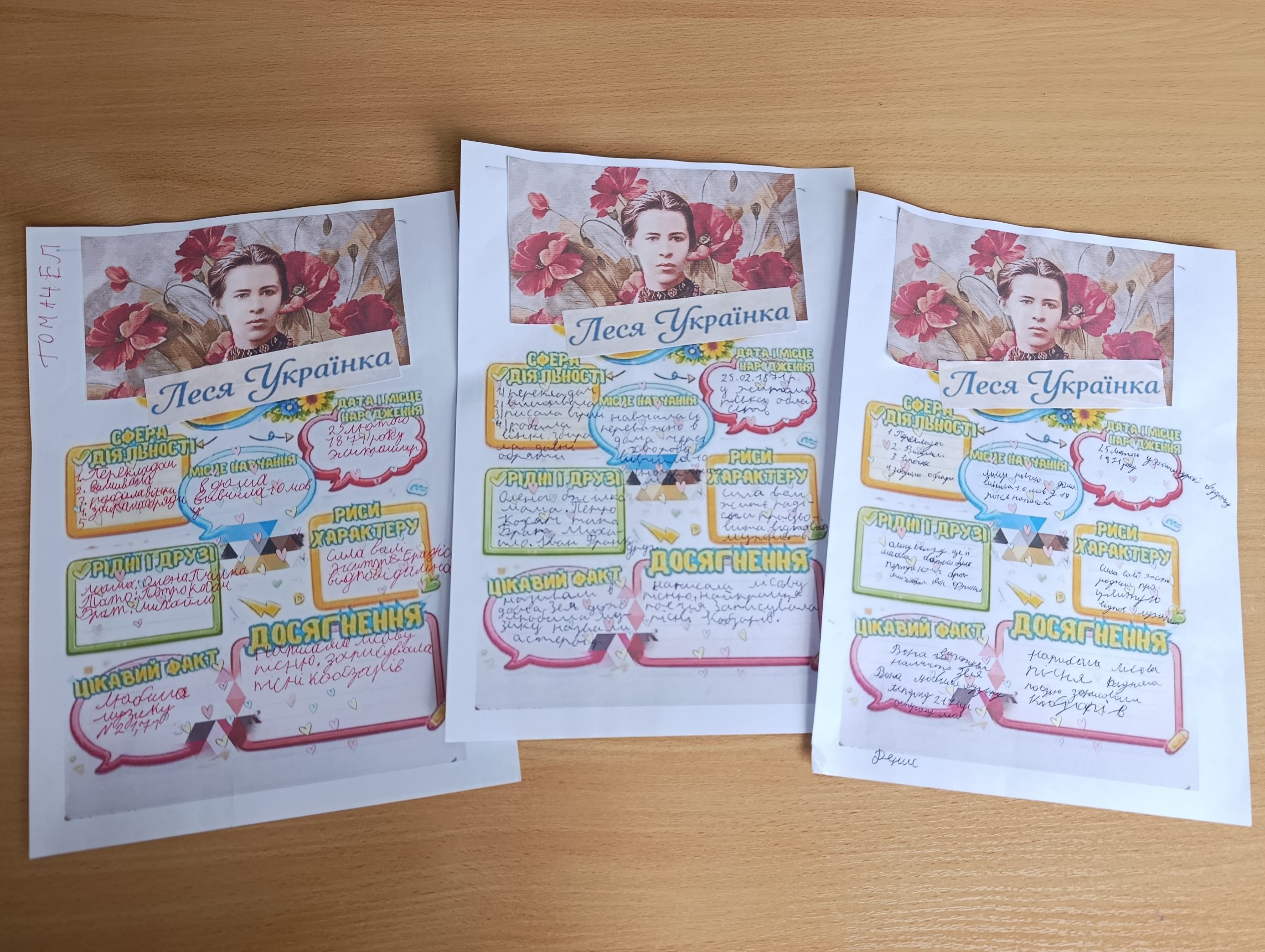 Разом із дітьми ми пройшли шлях від дитинства маленької Лесі до вершин світової слави великої поетки. Нашим головним інструментом стали дидактичні картки «7 віконець-подій», які учні заповнювали в ході заняття